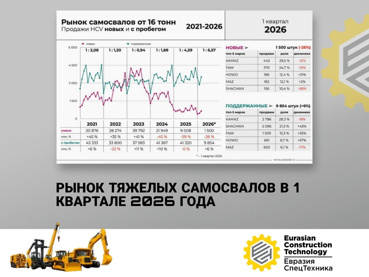 По данным "Автостата", которые в своем тг-канале опубликовал сооснователь и генеральный директор аналитического агентства Сергей Целиков, рынок тяжелых самосвалов в России за первый квартал текущего года упал на 26%.