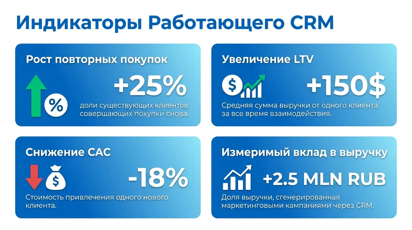 Все индикаторы — в деньгах. Растет доля повторных покупок в общей выручке. Растет LTV по когортам. Снижается CAC через удержание. И главное — CRM-маркетинг имеет измеримый вклад в выручку бизнеса, который можно защитить перед акционерами.