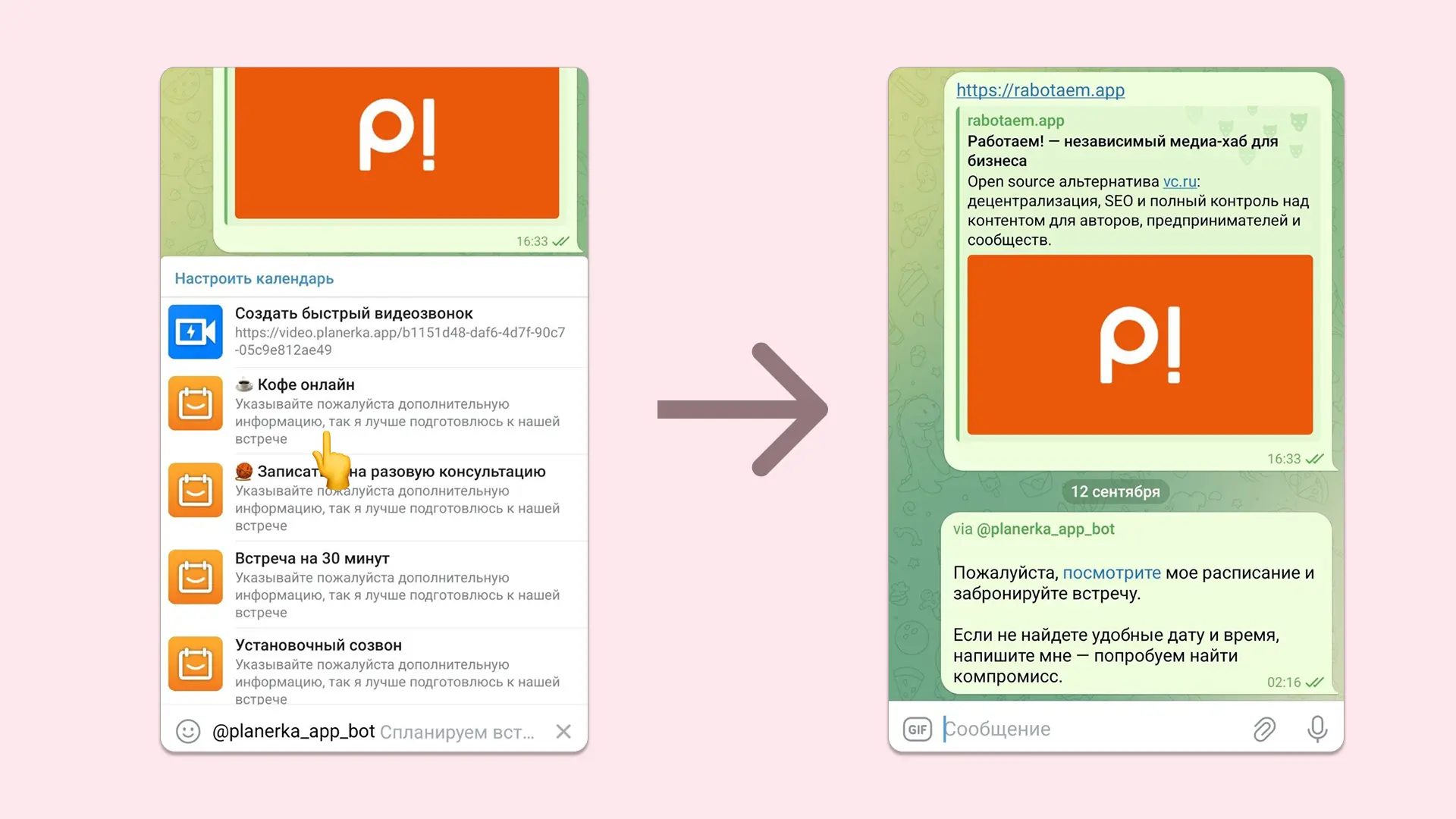 ☝️ Вы можете организовать встречу сразу во время нетворкинга. Через Telegram. Просто введите @planerka_app_bot в чате, выберите нужную встречу, и бот моментально отправит ссылку на нее собеседнику.