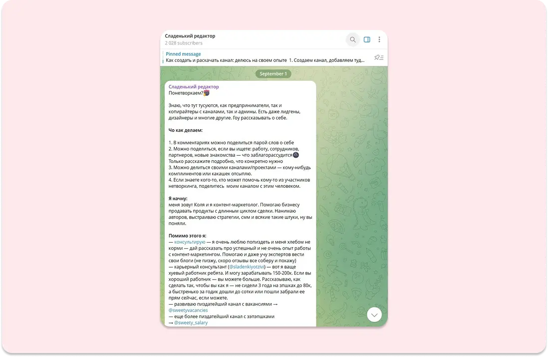 Специализированные телеграм-каналы и чаты: в них можно найти профессионалов из нужной сферы и задать вопрос, начать дискуссию. Например, в своем телеграм-канале «Сладенький редактор» контент-маркетолог Коля Муравьев постоянно организовывает онлайн- и офлайн-мероприятия для нетворкинга.