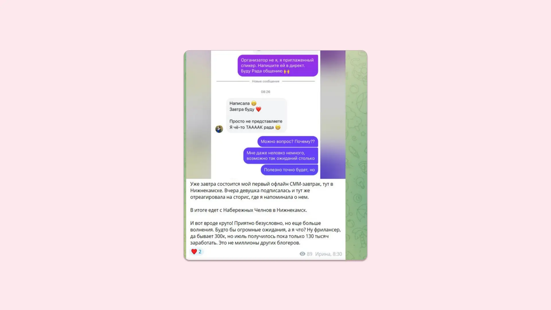 Пишите в личные сообщения, указывая контекст. Например: «Дарья, увидел, что вы занимаетесь закупкой рекламы в телеграм-каналах. Мы тоже тестируем подобную схему. Хотел бы узнать ваше мнение...». Шансы, что вам ответят, вырастут в разы.