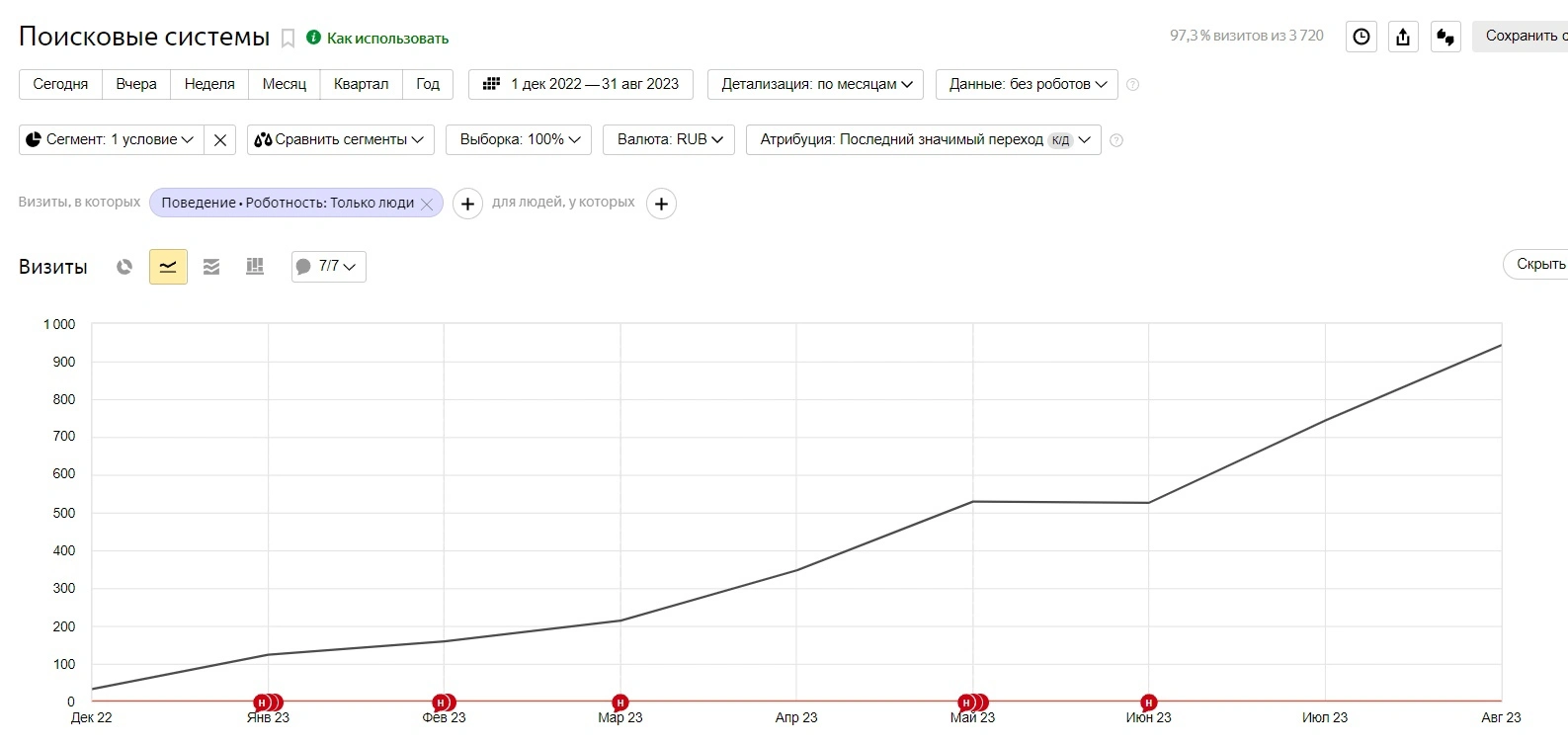 По данным сервиса веб-аналитики Яндекс.Метрика, уже через 3-4 месяца после старта работ был зафиксирован существенный рост посещаемости сайта "Флаконы для духов". Если на стартовом этапе среднемесячный трафик не превышал 40 уникальных посетителей, то к контрольной точке этот показатель достиг впечатляющей отметки в 950 визитов. В процентном соотношении прирост трафика составил колоссальные 2275%!