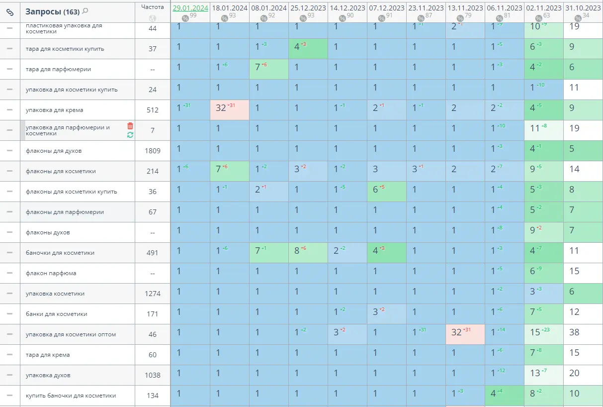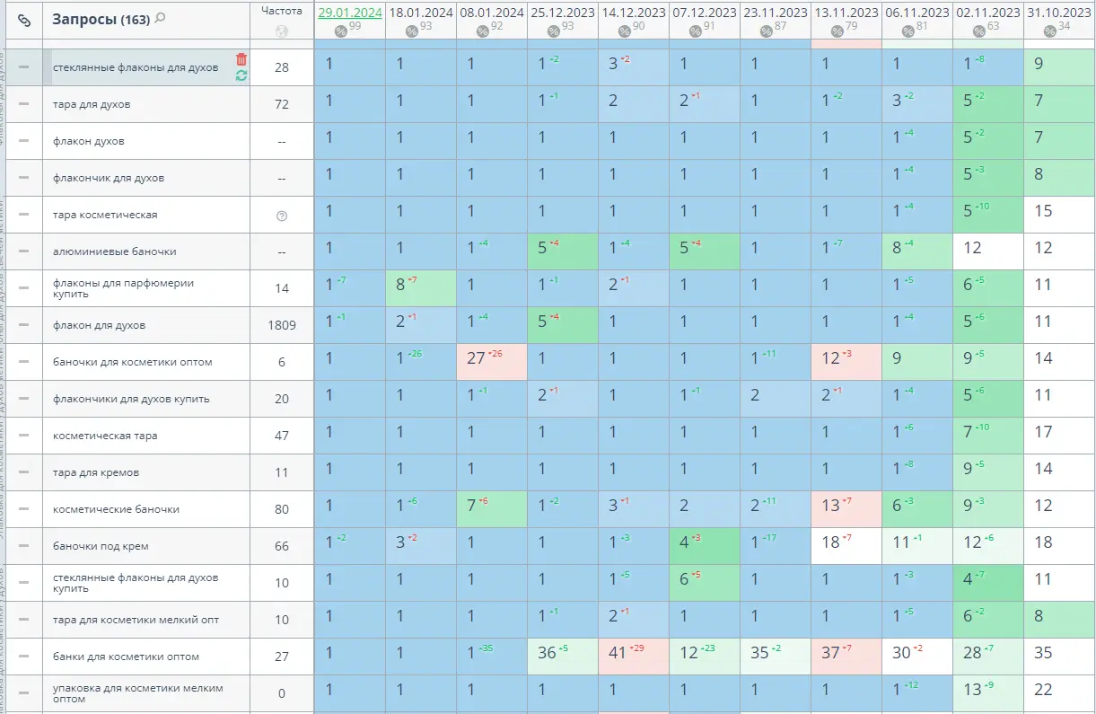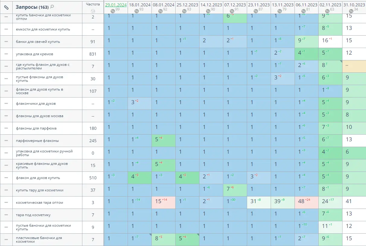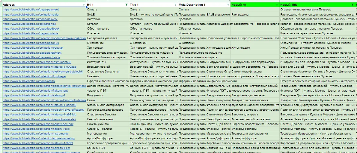 Затем параллельно велся сбор семантического ядра по всей тематике сайта при помощи специализированных сервисов. Были собраны как ключевые фразы общей тематики, например "флаконы для парфюмерии", так и более конкретные нишевые запросы вроде "купить флаконы для парфюмерии оптом". Все ключи были распределены на кластеры по принципам смысловой близости и товарной принадлежности.