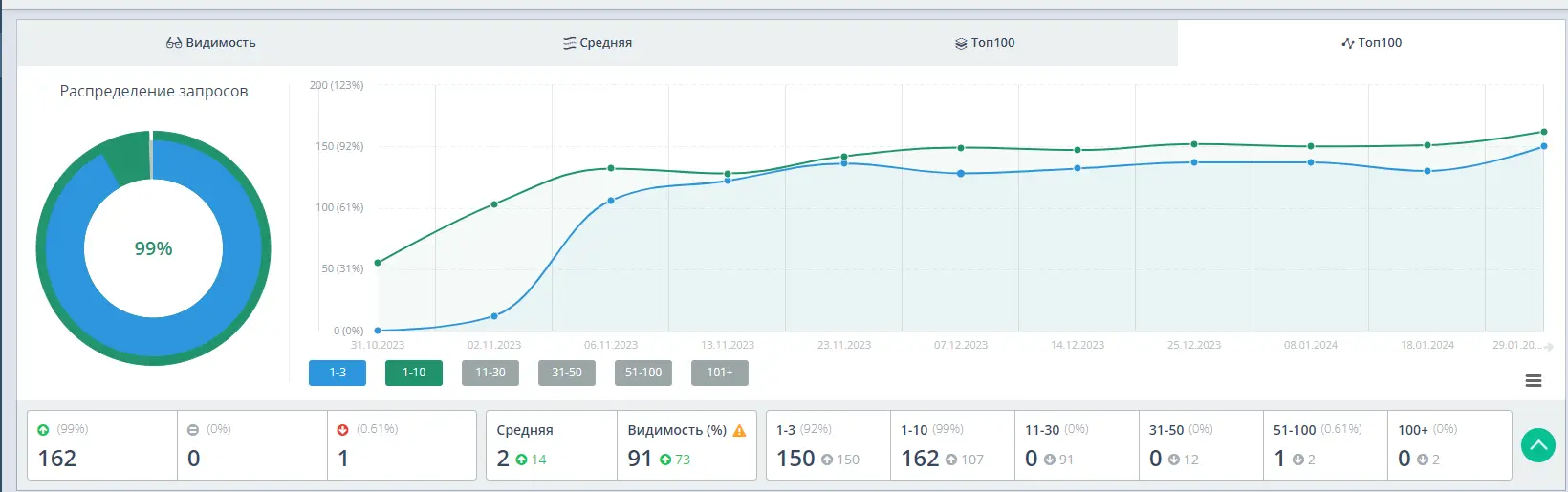 Также невозможно переоценить важность формирования оптимальной структуры с распределением всего семантического ядра по целевым страницам. Решение данной задачи обеспечило идеальную релевантность посадочных страниц под каждый кластер коммерческих запросов, что отразилось на впечатляющем росте видимости в ТОП-10.