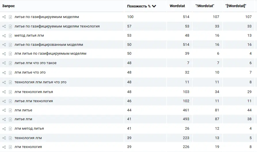 Семантическое ядро формировалось с учётом отраслевых особенностей. В нише литья и производства автокомпонентов преобладают информационные и комбинированные запросы: