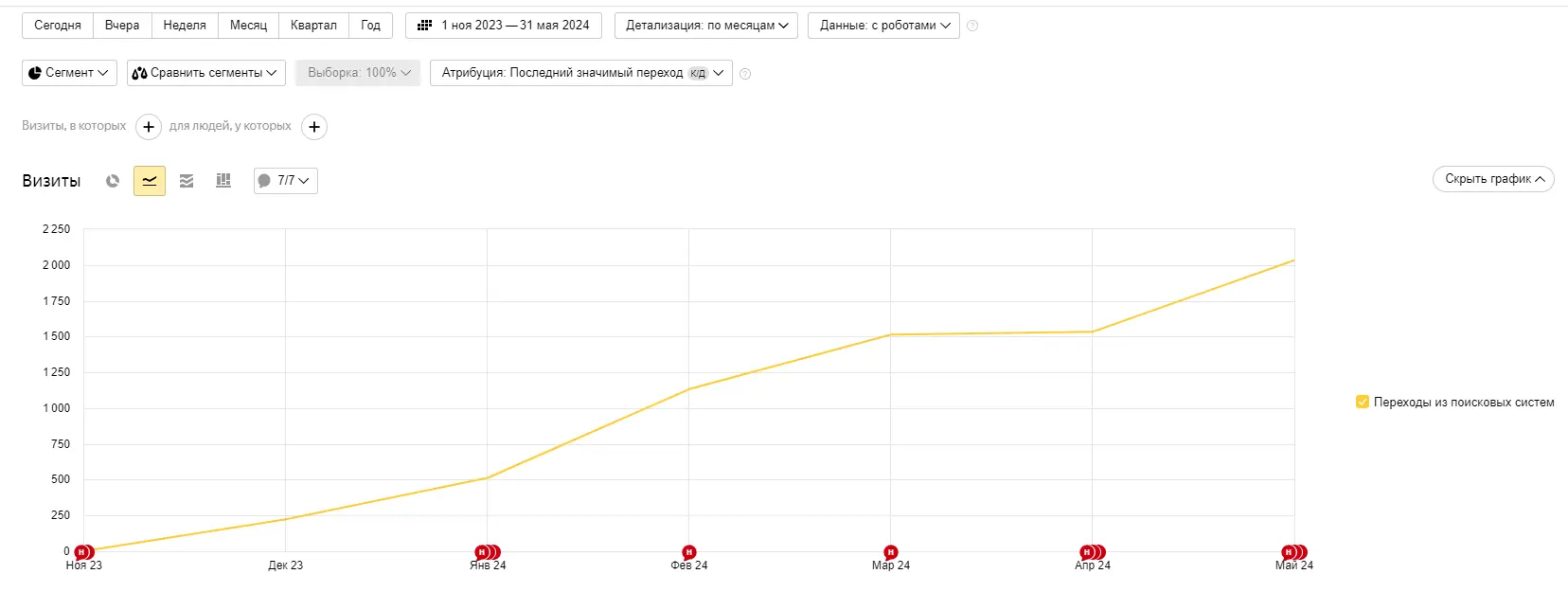 Для наглядности проанализируем статистику посещаемости ресурса из поисковых систем за период с ноября 2023 года по май 2024 года.