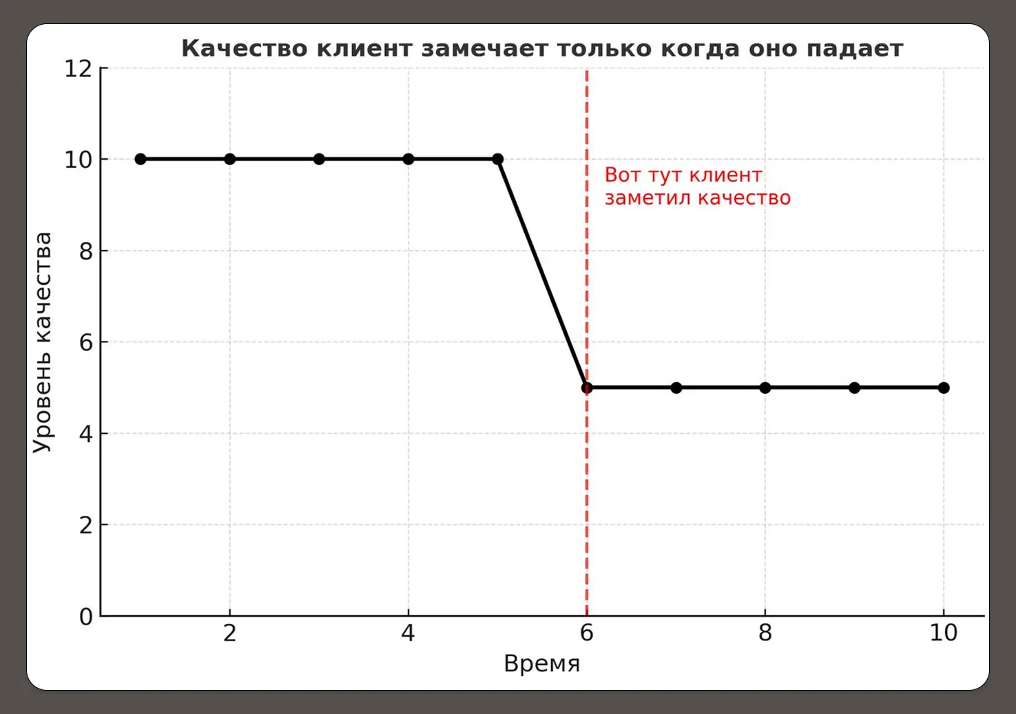 Качество — это когда клиент молчит. Когда у него нет вопросов. Не «высокое», не «абсолютное», а просто «без вопросов». Как только ты просадишь планку — тебе это тут же припомнят. Потому что смотри заголовок.