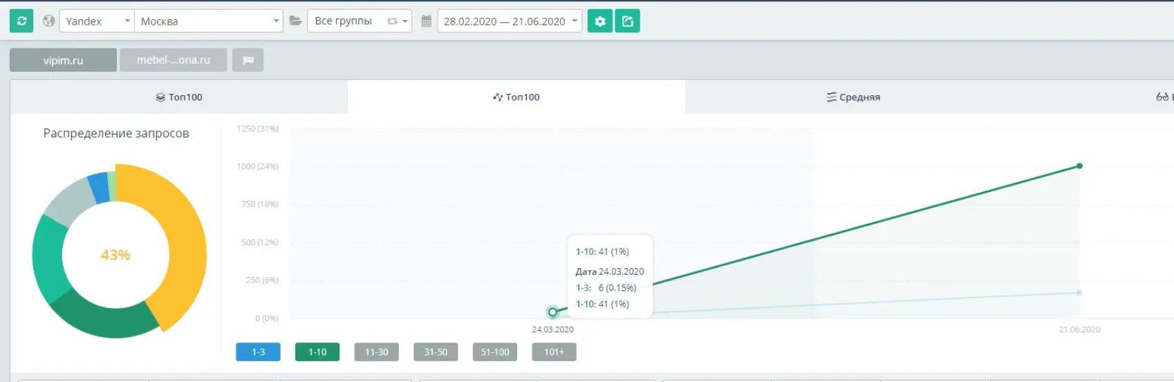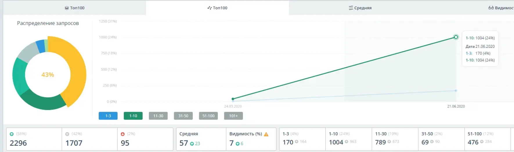 В результате проделанной работы сайт клиента из низких позиций в выдаче поднялся на лидирующие строчки по ключевым коммерческим запросам, таким как "парикмахерские тележки" и "парикмахерские кресла". Количество запросов, по которым сайт присутствовал в ТОП-10, выросло с 41 до 1004, что свидетельствует о масштабном успехе проекта.