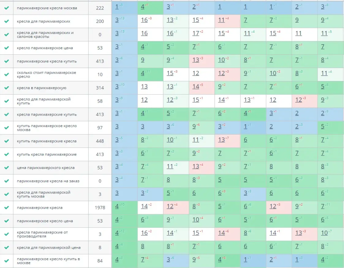 По целевым запросам "парикмахерские тележки" и "парикмахерские кресла", имеющим ключевое значение для бизнеса клиента, нам удалось вывести сайт на лидирующие позиции в ТОП-10 поисковой выдачи. Это обеспечило существенный приток целевого трафика на сайт и повысило его узнаваемость среди потенциальных покупателей.