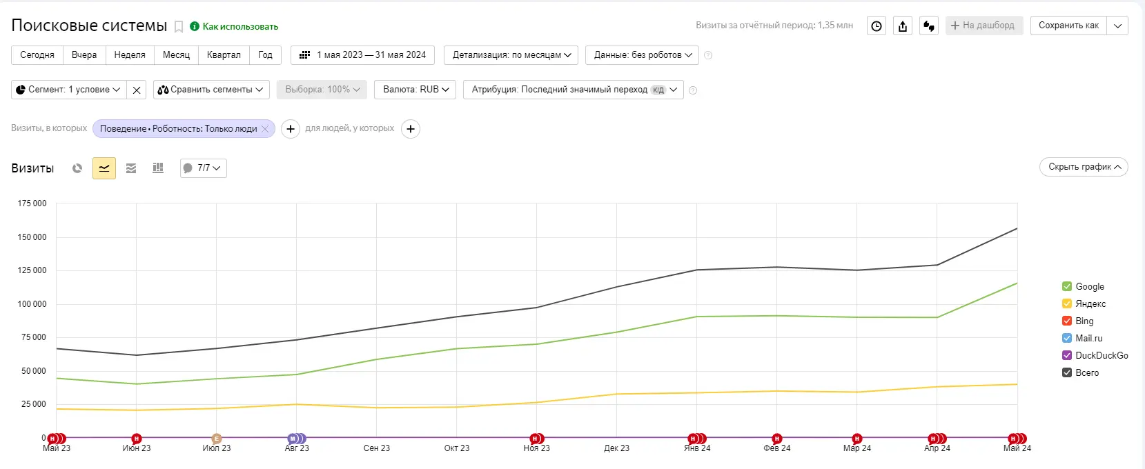 Одним из главных достижений стал значительный рост трафика из поисковых систем. За период с октября 2023 года по май 2024 года количество посетителей, пришедших на сайт из поиска, увеличилось на впечатляющие 73%.