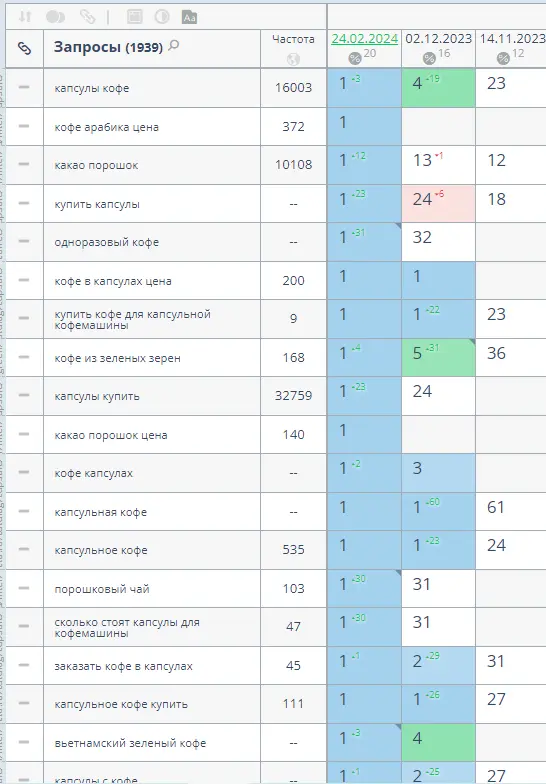 Помимо роста трафика, нам удалось существенно улучшить позиции интернет-магазина в поисковых системах по ключевым коммерческим запросам. Благодаря позиционной оптимизации и созданию новых релевантных страниц, сайт клиента стал занимать гораздо более высокие места в выдаче по таким запросам, как "купить кофе", "элитные сорта чая", "шоколад ручной работы" и многим другим.