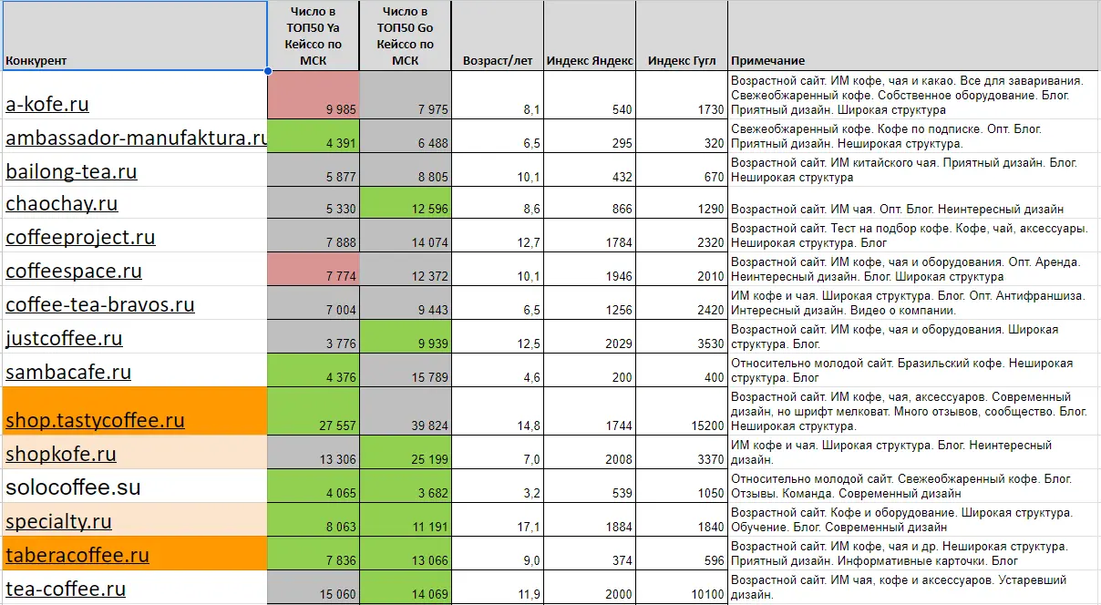 Кроме того, мы провели оценку охвата структуры по коммерческим страницам на сайте клиента и у основных конкурентов. Это позволило выявить пробелы и определить направления для дальнейшего расширения структуры нашего интернет-магазина. Анализ показал, что у конкурентов имелись более детализированные страницы для отдельных коллекций и сортов кофе/чая, а также специальные разделы для аксессуаров и подарочных наборов.