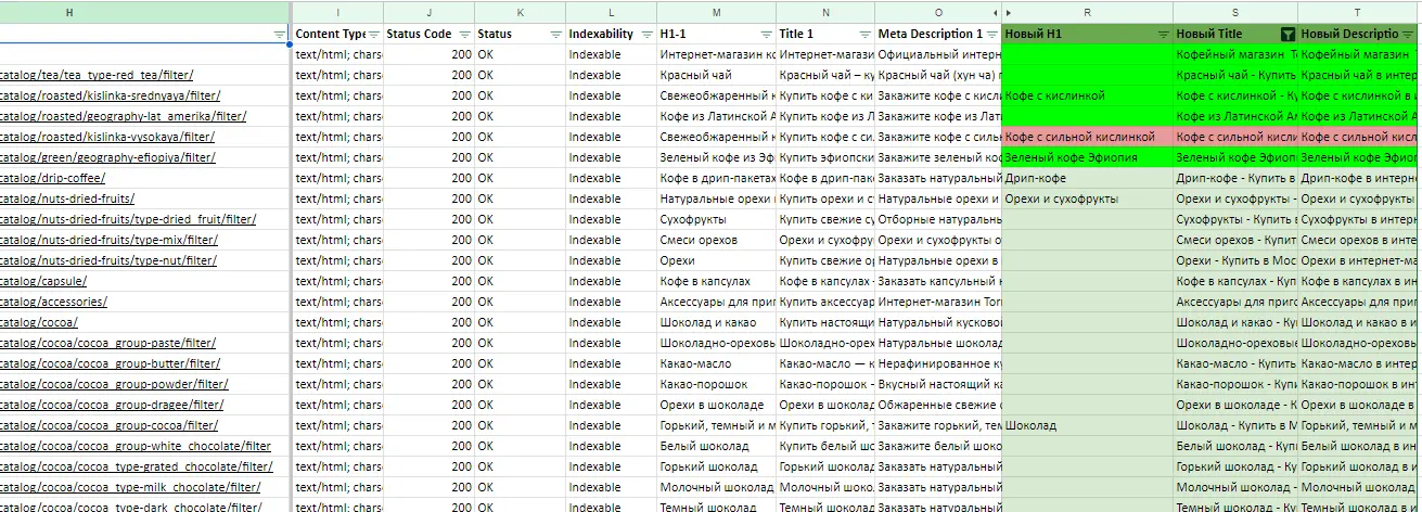 Также мы выявили страницы с низкой частотностью или склейкой нескольких запросов. Для таких страниц был сформирован отдельный лист со склейкой, и мы подготовили необходимые редиректы, которые впоследствии были настроены на сайте. Это позволило избежать дублирования контента и обеспечить более четкое распределение семантики по страницам.