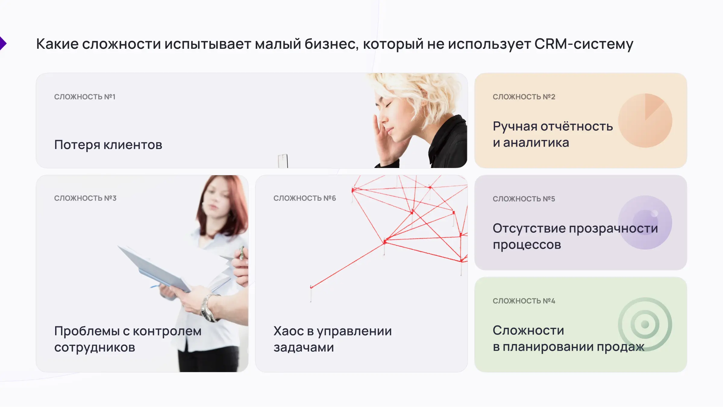 Малый бизнес, не использующий CRM-систему, сталкивается с рядом сложностей, которые затрудняют управление клиентами, задачами и продажами, снижая эффективность работы и приводя к упущенной прибыли. Приведем основные из них: