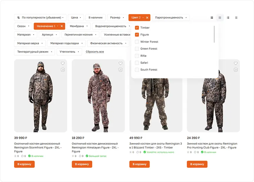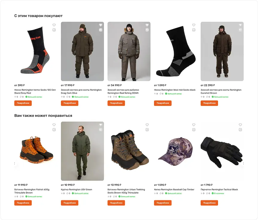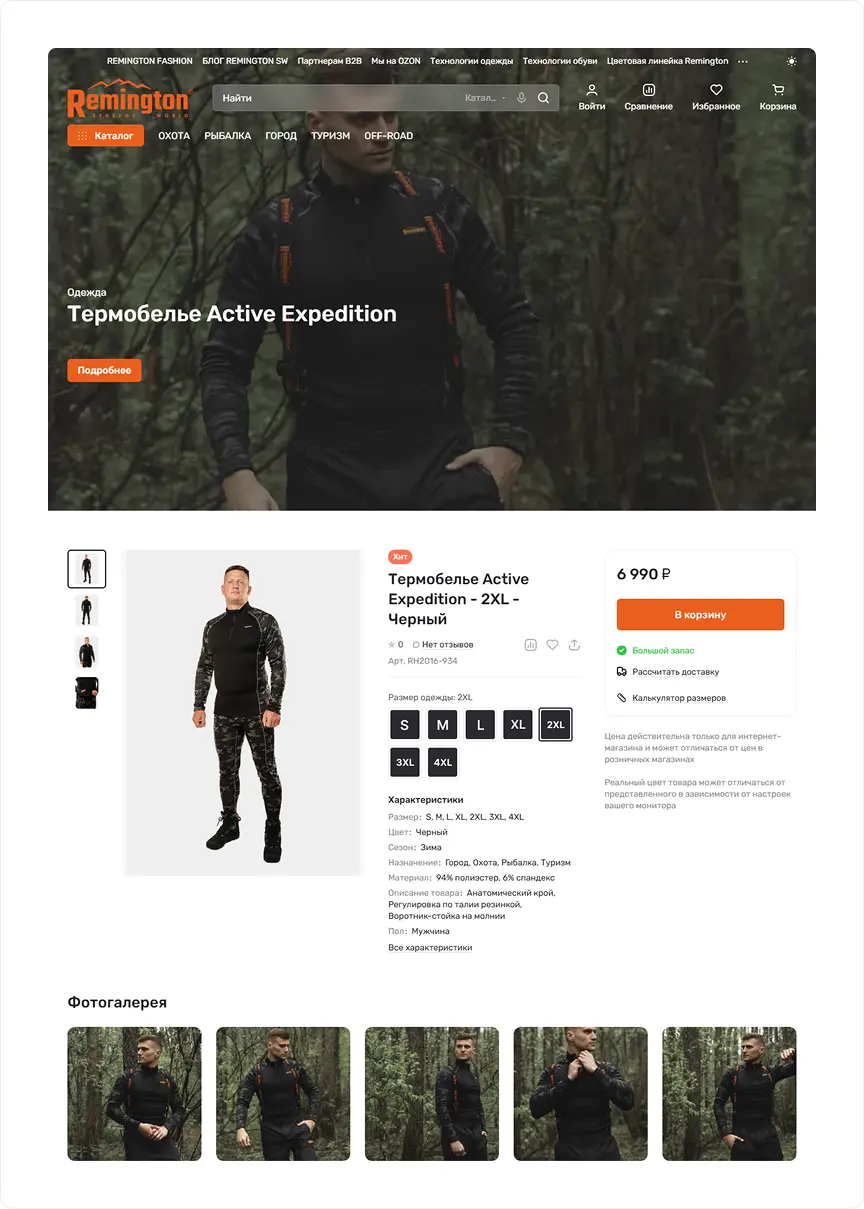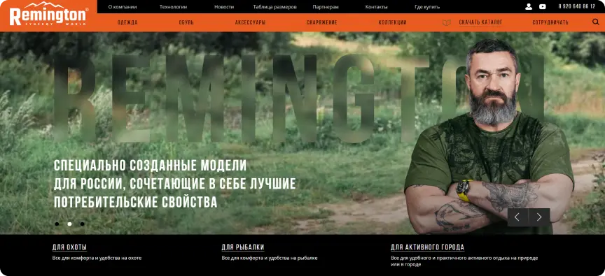 Компания Remington продает одежду, обувь и аксессуары для охоты, рыбалки и туризма. Они поставили перед нами задачу — создать интернет-магазин с возможностью онлайн-оплаты, доставки по всей России и калькулятором размеров. В их каталоге — более 500 товаров. Требуется удобный сайт, который улучшит клиентский опыт и ускорит процессы покупки.