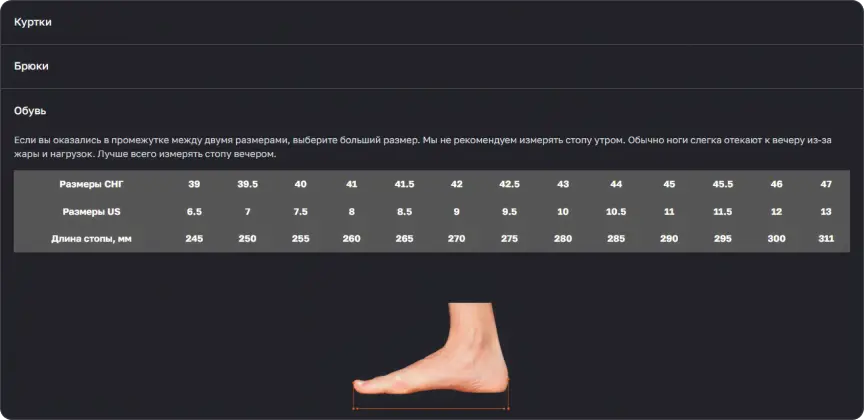 - Калькулятор размеров для точного подбора одежды и обуви.