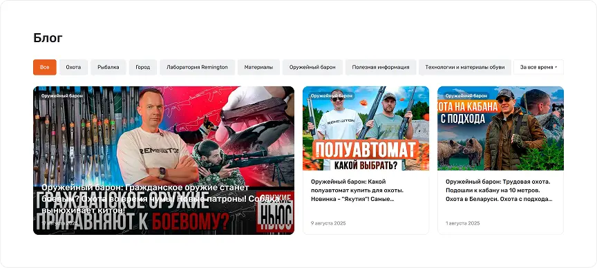 - Блог. С блогом Remington мы интегрировали поиск по тематическим тегам и годам выпуска, чтобы пользователи могли легко находить интересные статьи.