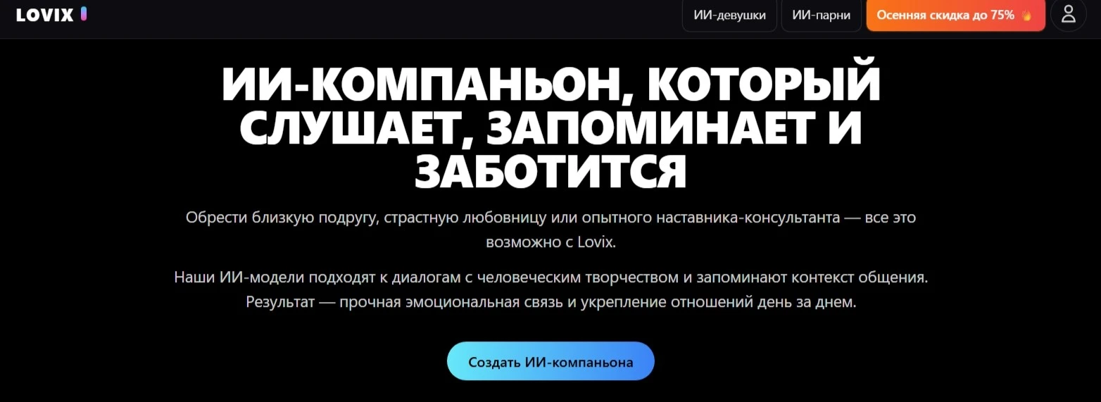- Lovix.ai — предлагает создать собсвтенного ИИ-бота для общения или выбрать одного из более чем 20 готовых вариантов.