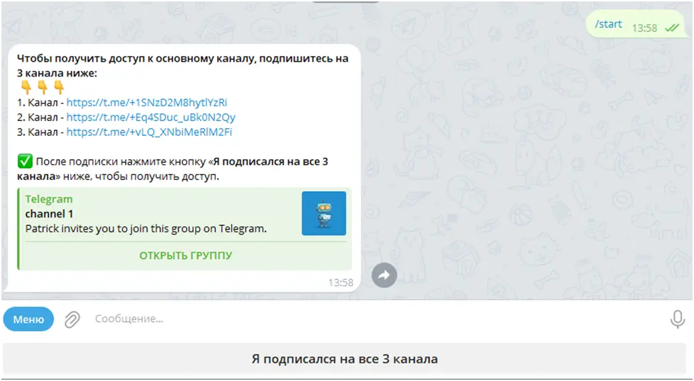 2. Нажимает «Я подписался на все 3 канала», следом бот проверяет подписку