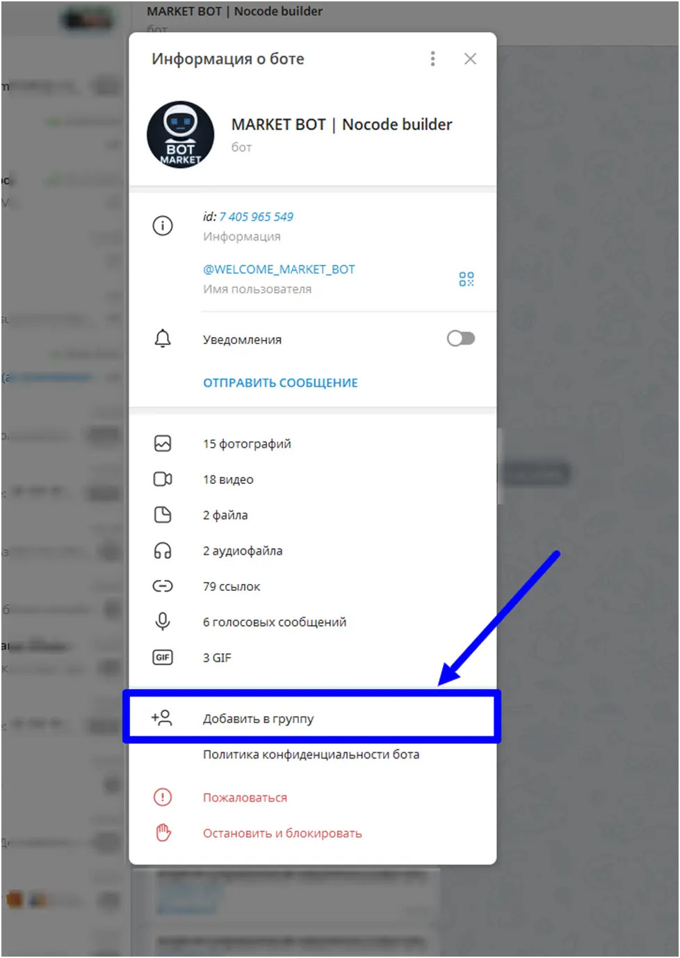 На этом этапе необходимо добавить бота администратором в Ваши чаты или каналы