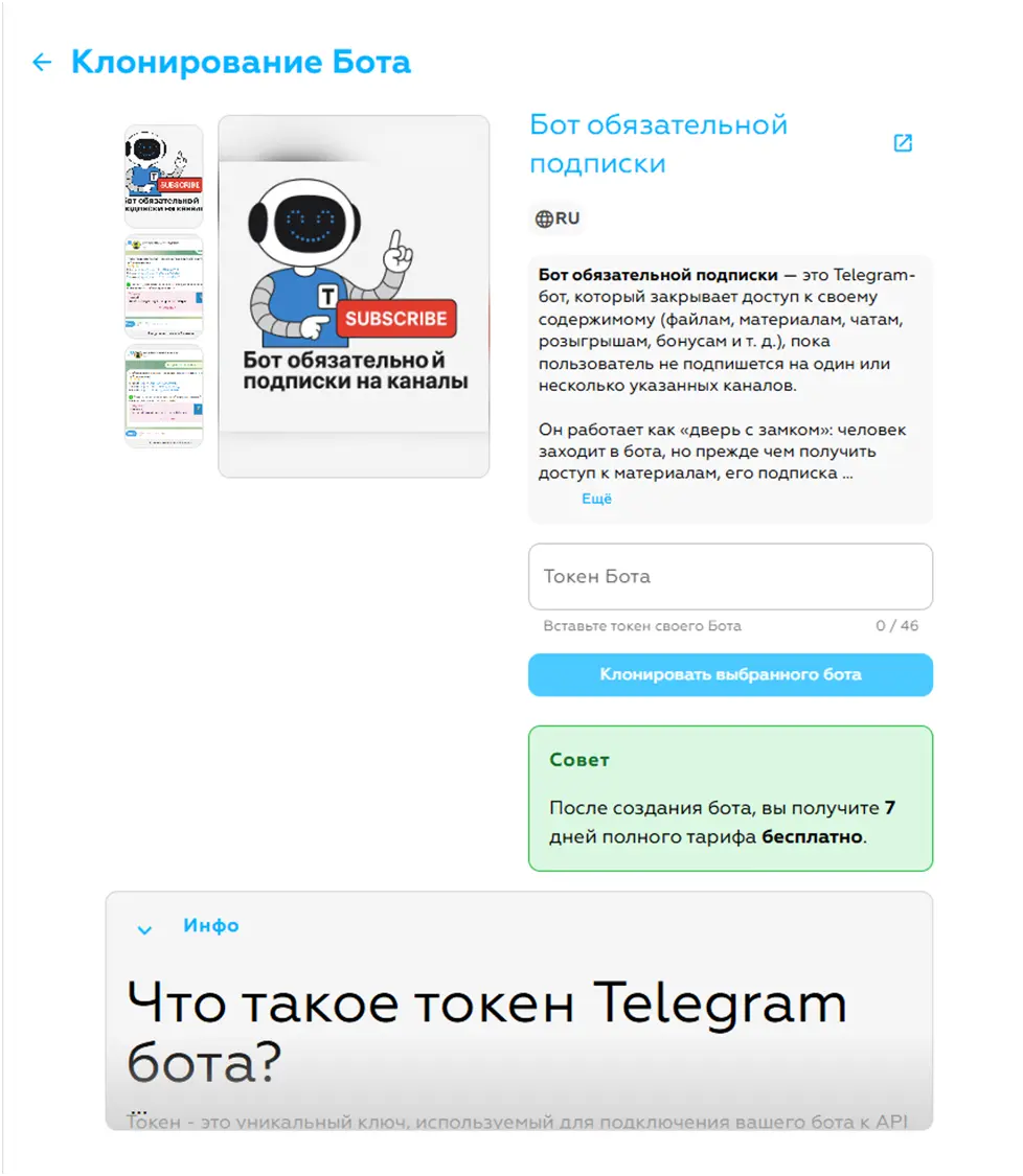 • Для клонирования бота укажите в поле «Токен Бота» ранее скопированный API токен из @botfather
