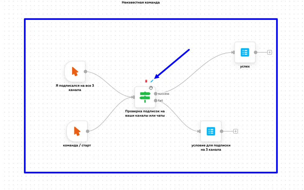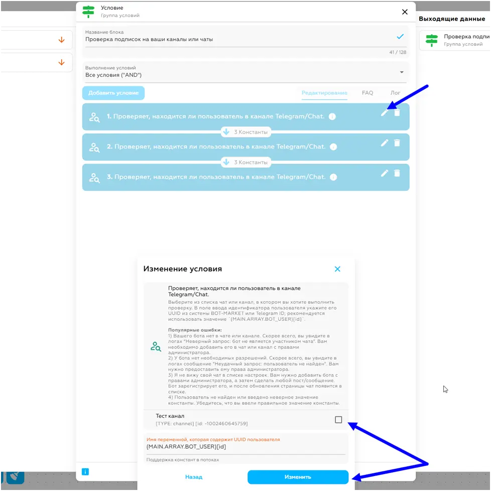 • По умолчанию в шаблоне «бот обязательной подписки на канал» готовая настройка предусматривает проверку подписки в трёх ресурсах. Для того, чтобы выбрать свой канал как объект проверки подписки – кликаем на карандашик и выбираем необходимый канал