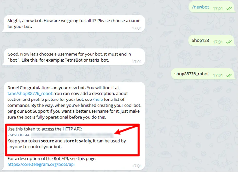 • Копируем полученный API-токен, просто кликнув на него (в сообщении токен копируемый) – он нам скоро понадобится.