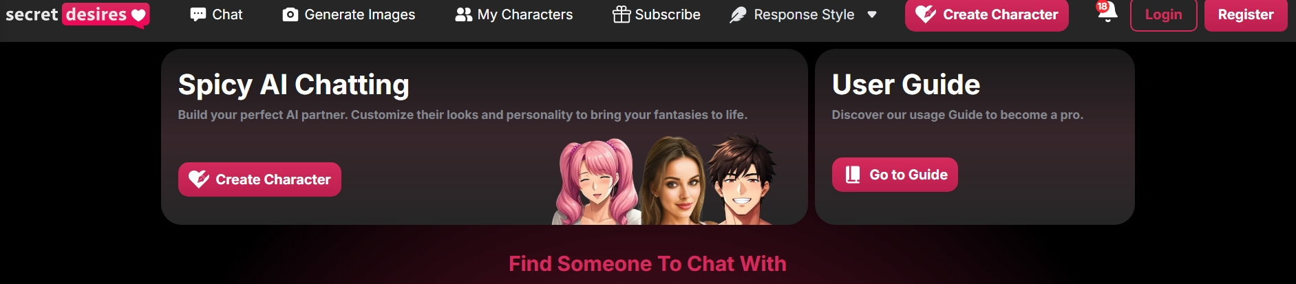 - Secret Desires — это онлайн-платформа, предлагающая пользователям возможность общения с ИИ-персонажами в приватной и безопасной обстановке.