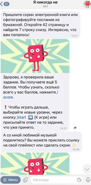 В квестах большое значение имеет хороший визуал: он помогает погрузить пользователя в атмосферу и вовлечь в игру. В этом также помогают голосовые сообщения и «кружки», но важно не переусердствовать с ними, чтобы геймификация не стала навязчивой и пользователь точно добрался до финала. В конце можно наградить игрока спецпредложением, чтобы у него был стимул участвовать и в других активностях компании.