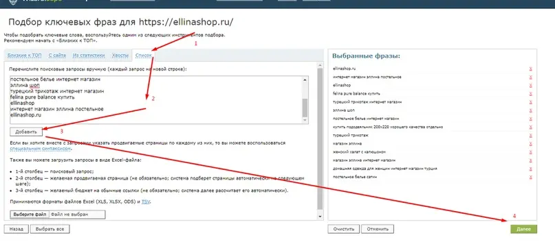 - Переход во вкладку "Списки" и добавление всех ранее собранных ключевых фраз.