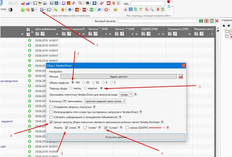3. Запуск парсинга частотности путем нажатия на кнопку "Получить данные с Яндекс.Директ".
