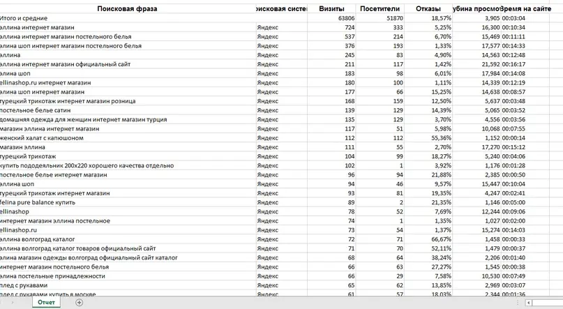 Полученный файл содержал список всех поисковых запросов, по которым сайт получал трафик за последний квартал, а также количество визитов и отказов по каждому запросу.