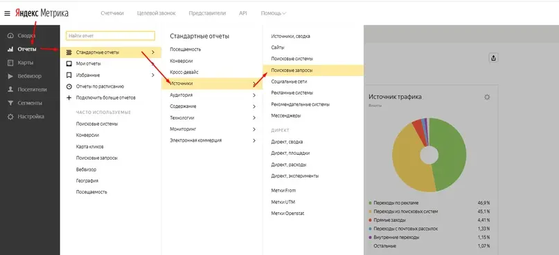 - Зайти в раздел "Отчеты" - "Поисковые фразы" в интерфейсе Яндекс.Метрики.