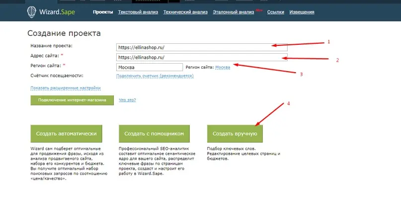 - Ввод названия проекта, адреса сайта и выбор региона (в нашем случае - Россия).