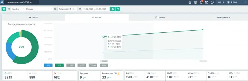 Перед началом работы над проектом ситуация была следующей: в ТОП-10 присутствовало всего 3129 запросов. Цель заключалась в том, чтобы существенно нарастить этот показатель, используя методику "Активной семантики". Данный подход основан на тщательном сборе и анализе релевантной семантики, ее привязке к соответствующим страницам сайта и последующей оптимизации контента.
