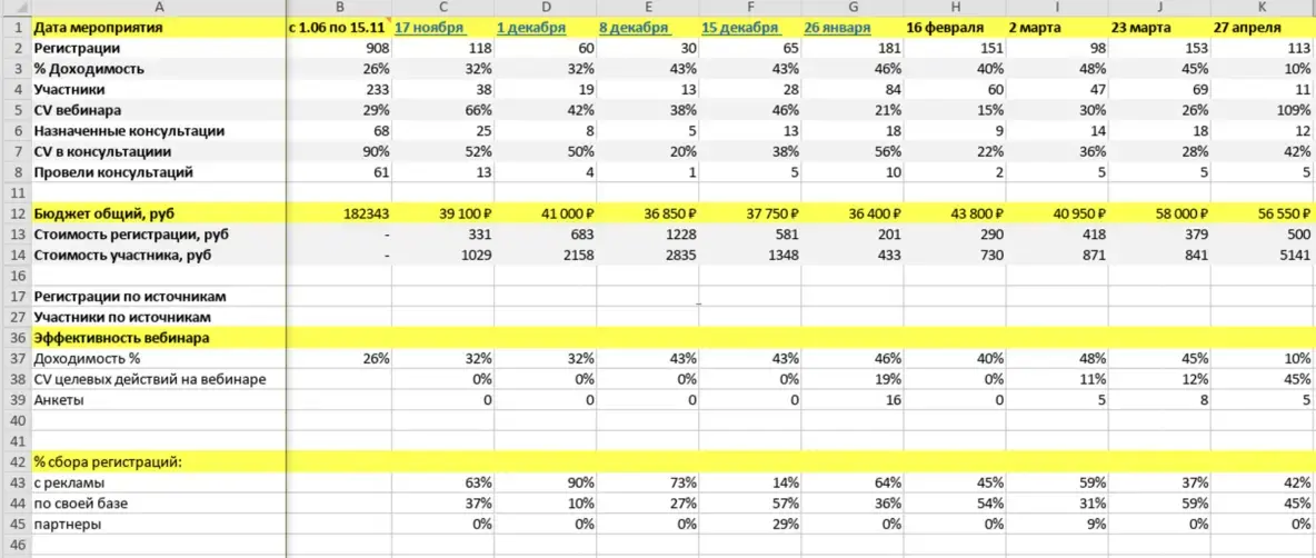 За 6,5 месяцев работы провел 10 вебинаров, куда привлек 1035 регистраций, с помощью посевов в Телеграм, email-рассылок, рассылок через what’s app business и рекламу в Я. Директ.