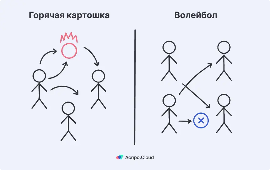 Чтобы лучше понять, как работает матрица RACI, представьте две игры: «горячая картошка» и волейбол. В обеих играх игроки выполняют схожую функцию — отбивают мяч, но принцип работы команды сильно отличается.