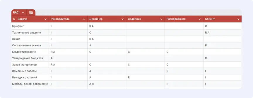 Роли в матрице. Лучше указывать не конкретных людей, а должности. Это особенно полезно в случае, если кто-то из сотрудников уходит в отпуск или отсутствует по другой причине. Например, если «Роза» — ответственный за посадку растений, а ее сменяет «Тимур», то роль в таблице будет привязана не к имени, а к должности.