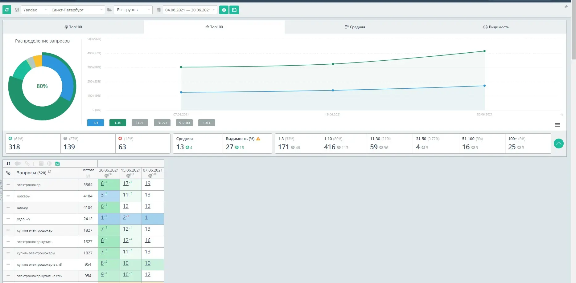 Наиболее значимым достижением стал выход в ТОП-10 по ключевым коммерческим запросам высокой частотности, среди которых: