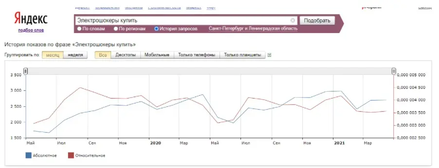 Как видно из графика, посещаемость сайта имеет четко выраженную сезонность с пиковыми значениями в августе, апреле и январе. Эта динамика полностью совпадает с трендами поисковых запросов на тему электрошокеров.