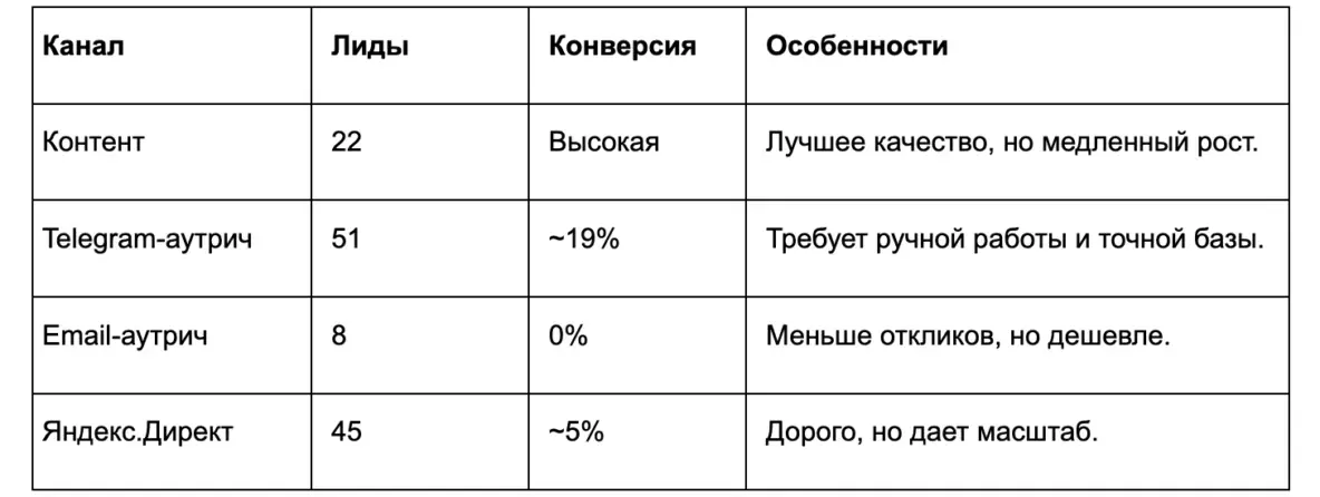 Пробовали всё: контент, холодные рассылки, платный трафик. Сравнивали, отсеивали, масштабировали. Без этого этапа были бы провалы в бюджете.