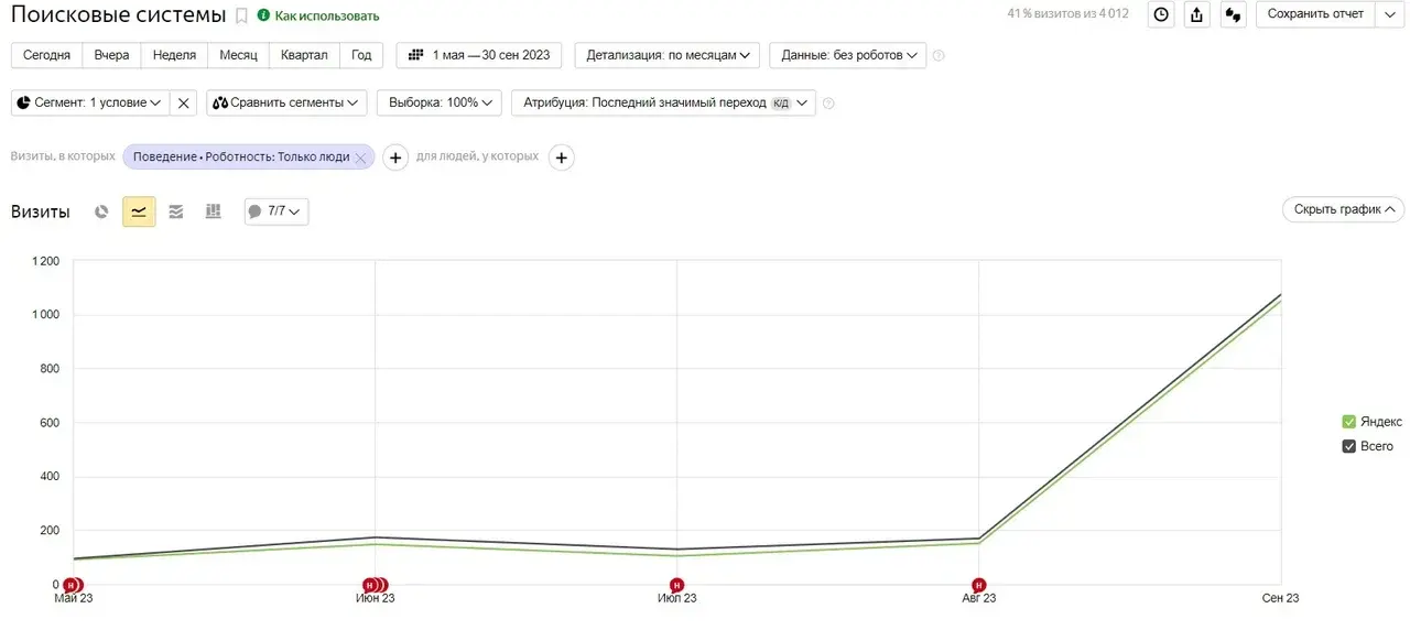 Такие значительные улучшения позиций закономерно привели к существенному росту трафика на сайт. Согласно данным Яндекс.Метрики, в мае 2023 года количество посетителей сайта составляло всего 100 человек. Однако уже к сентябрю этот показатель вырос до 1100 посетителей, что соответствует увеличению трафика на впечатляющие 1100%.